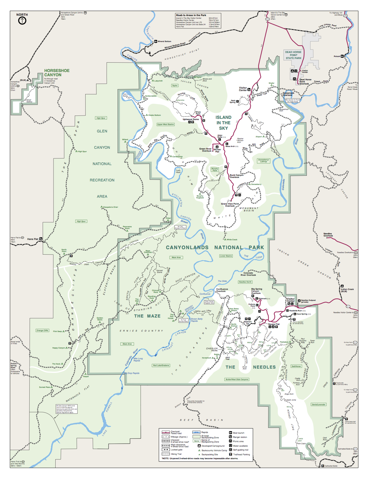 Canyonlands est découpé par le Colorado en trois parties qui ne communiquent pas: Island in the Sky, the Needles et the Maze. Nous ne visiterons que la partie accessible depuis Moab, Island in the Sky.