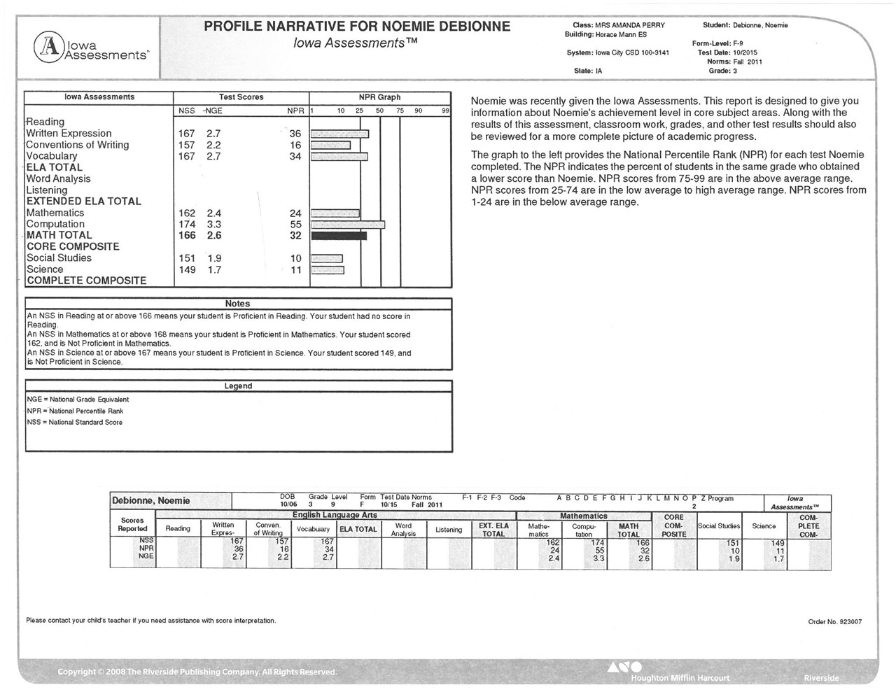L'état de l'Iowa a mis en place l'Iowa Assessment, des tests et outils statistiques pour évaluer le niveau et les progrès des élèves. Cela permet de repérer pour chaque élève ses points faibles et de comparer ses performances à un large échantillon (en l'occurence, tous les élèves de l'Iowa).