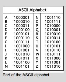 Moi j'ai choisi orange pour 0, violet pour 1 et rose pour espace. 8 valeurs binaires font une lettre.