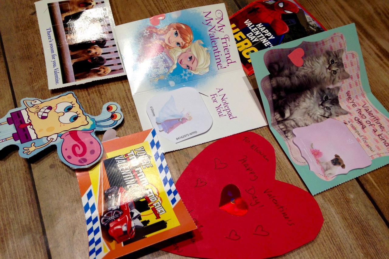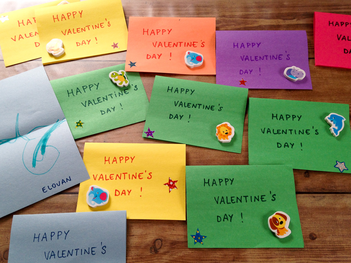 La Saint Valentin est l'occasion pour les enfants de s'échanger, notamment à l'école, des petites cartes et des bonbons bien sur. Les instits veillent à ce que les élèves apportent une carte pour chacun. Ca fait quelques cartes à écrire! La classe de Philomène a organisé des jeux et un petit gouter.