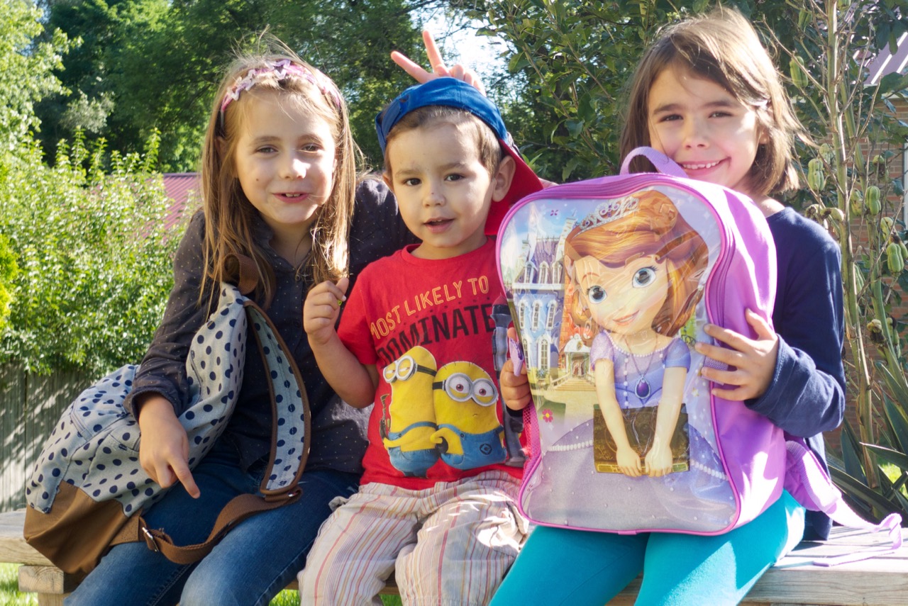 Les cartables sont pleins de fournitures. Stylos, crayons, scotch, colle et mouchoirs.