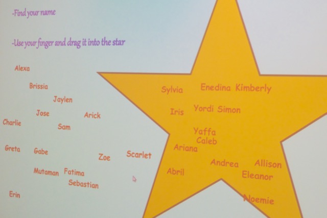 Chaque classe est équipée d'un Magic Board, un tableau électronique. Ici utilisé pour faire l'appel : les enfants font glisser leurs prénoms dans l'étoile.