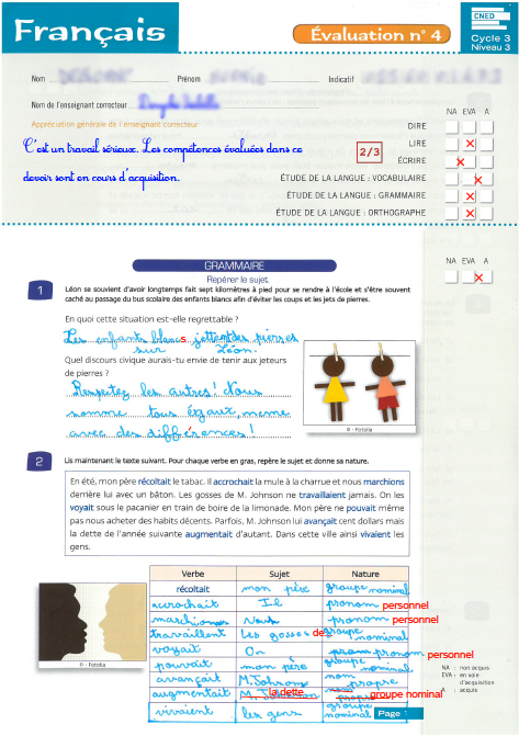 Les semaines sont regroupées en unités qui se concluent par une évaluation. Nous essayons de jouer le jeu: on révise et Noémie fait son devoir seul.