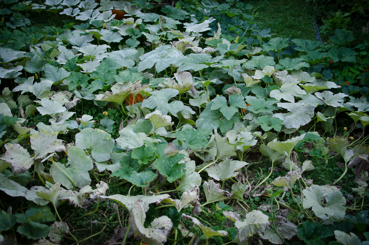 C'est avec désolation que nous vous informons de la contamination de nos plants de courges par l'Oïdium des cucurbitacées. Les feuilles, d'abord tachées de blanc, finissent par faner empêchant la bonne maturité des fruits qu'elles cachent. Une forte humidité de l’air sont des facteurs favorisants... on se demande juste comment nous n'en avons pas eu avant.